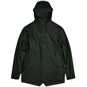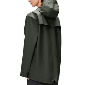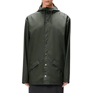 Rains Rain Jacket Olive Green Unisex Large Hood Buttons Pockets Vented 1201