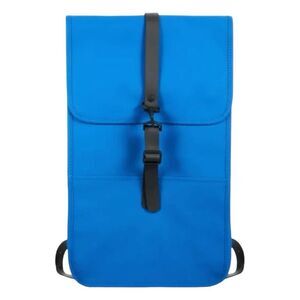 Rains Solid Backpack in Waves Blue with Black Trim. It is cut from Rains' signature PU fabric, engineered for carrying strength, durability and a smooth feel. Clean and ever-contemporary, the Silhouette is characterized by its squared shape and flap with magnet snap fastenings.