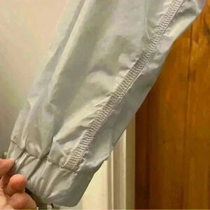 Rains unisex track jacket in sky blue. This jacket features a standup collar, elastic waist, and a zipper pocket for added convenience. The softshell fabric is breathable and lightweight. The jacket is machine washable, and comes in a size small. Suitable for walking, golf or any other activity. The solid pattern and relax fit make it a stylish and comfortable choice for any occasion. NWT