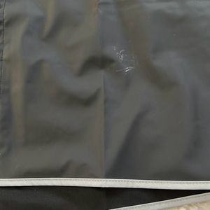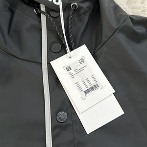 This jacket is made from a lightweight, waterproof fabric, making it perfect for any weather. The reflective trim adds a unique touch, while the snap-style closure and hoodie provide extra protection from the elements. The front slanted pockets offer extra storage and convenience.