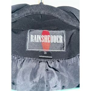 The Rainshedder overcoat is a women's size 20, designed for regular fit. It features a solid black color with a button-up front and stylish button details. The coat has a lined interior and classic long sleeves, making it suitable for fall and winter seasons. This long overcoat is versatile for various occasions, including business, casual, formal, travel, and workwear. It is machine washable for easy garment care. The outer shell material is unknown. This item is pre-owned.