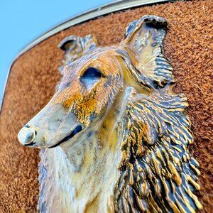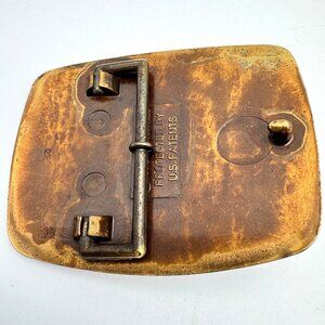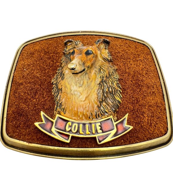 This vintage belt buckle, featuring a collie dog design, combines metal craftsmanship with a faux leather accent. Its unique 1979 Raintree creation ensures collectible appeal.