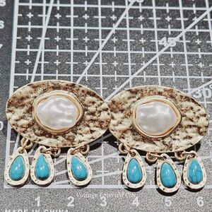 These gorgeous, whimsical earrings feature faux freshwater white pearls as cloud-like accents, with stunning faux blue turquoise beads simulating raindrops. Set in a gold tone finish, these dangle drop earrings are perfect for adding a touch of playful elegance to any look. A beautiful blend of colors and textures, these earrings are both lightweight and eye-catching. All earrings come with backs.