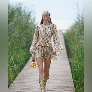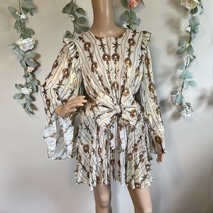 A romantic backless design with flowing bell sleeves framed with ruffles at the shoulders. A whimsical seashell stripe adds graphic impact. Roundneck Long sleeves Open back Polyester/sim Dry clean only Imported SIZE & FIT About 36" from shoulder to hem