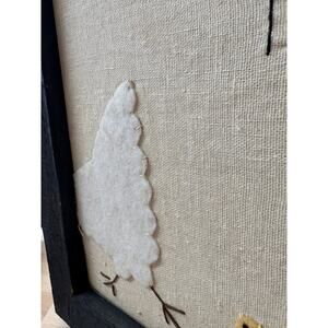This piece combines hand-stitched black thread text with whimsical felt appliqué—one large white hen and three trailing yellow chicks—all marching across a neutral linen background. Framed in rustic black wood and ready to display, it blends humor, parenting truth, and folk art appeal in one delightful wall accent.
