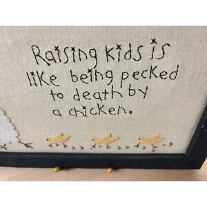 “Raising Kids” Chicken Embroidery – Framed Folk Art Quote with Felt Appliqué