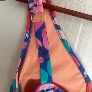 Vibrant floral design. Features pink and blue hues. Perfect for beach days.
