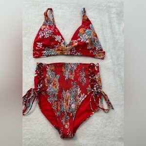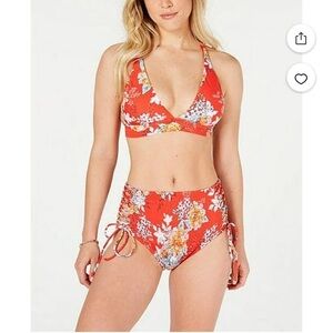 Dive into summer with this vibrant red and white bikini from Raisins, featuring a classic triangle top and high-waisted bottoms with adjustable side ties. The bold floral print adds a touch of tropical flair, making it a standout choice for beach or poolside relaxation.