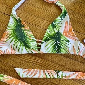 Bring a vibrant island vibe to your swimwear collection with this Raisins Palm Bralette Halter Bikini Top in size M. Designed with a supportive halter neckline, this top features a bold tropical leaf print in shades of green and orange. The strappy front adds a stylish accent, while the tie-back closure allows for an adjustable and comfortable fit—perfect for beach days, poolside lounging, or resort vacations.