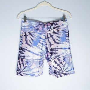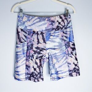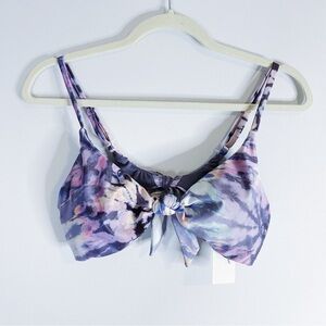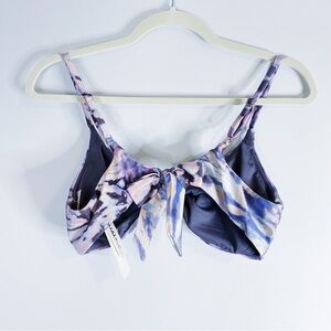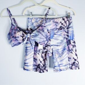 Raisins purple tie dye swim set. Top has adjustable straps and tie at back. Matching biker short swim bottoms.