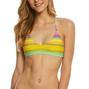 Features: Pull-on style; triangle style bikini top, allover stripe print, V-neckline, knotted macramé racer back design, over the shoulder spaghetti straps, removable soft cups.