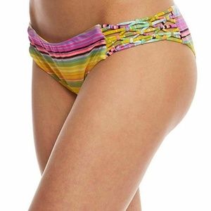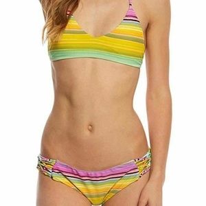NWT Raisins multi-color yellow, blue, pink, white bikini with macrame detailing on the open sides of bottom and back of the top.