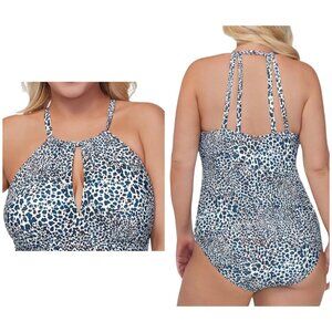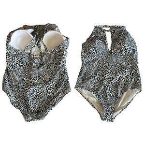 Raisins Women White Animal Print Stretch Strappy High Neck Keyhole Full Coverage