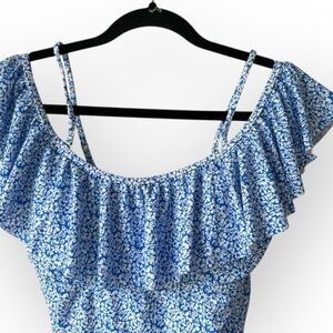 The Raisins Maui One Piece Swimsuit is a blue and white floral patterned one piece thatoffers a flutter detail and an off the shoulder neckline. This suit features removable shoulder straps a hook closure in back a low open back and cheeky bottom coverage.