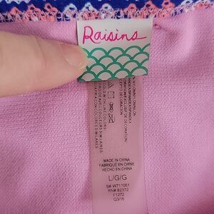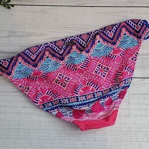 Vibrant colored Aztec print pink and blue bikini bottoms by Raisins with a cute side string detail. Great pre-owned condition, but the size probably fits more like a medium.