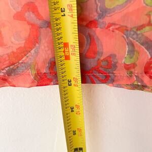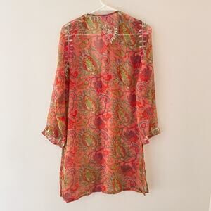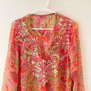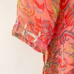 Beautiful vintage-inspired tunic top by Raj. Made from lightweight 100% silk chiffon with a vibrant paisley print in coral, pink, green, and purple tones. Features intricate floral embroidery around the neckline and cuffs, a relaxed boho fit, and sheer airy fabric — perfect for resort wear, layering, or as a chic beach cover-up.