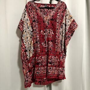 Raj 100% Silk Women's Kaftan Top - 100% silk, featuring a boho style print throughout with elephants on the front and a drawstring on the center chest area. Can also be used as a swimsuit cover. Gently used in great condition!
