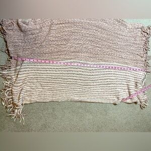 Crafted from a textured knit fabric, it offers both warmth and style. Has the feel of chenille. Very soft with Fringe on the sides.
