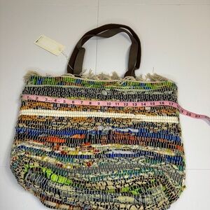 Crafted from multicolor woven fabric strips with durable brown handles, this oversized boho tote is perfect for the beach, farmer’s market, travel, or everyday carry.
