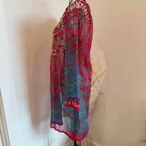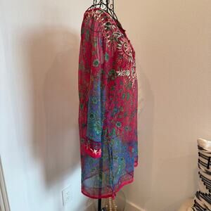 Raj Silk Embroidered Floral Sheer Long Sleeve Tunic Top Small