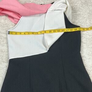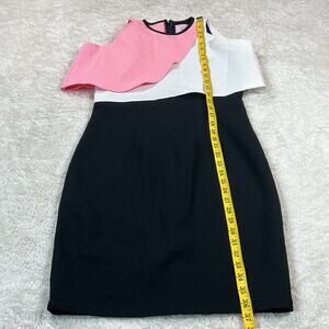 Structure meets and falls in love with the floaty with oversized panels of pink and white on the bust. Length is midi, with slit in back for added pizzaz. A bit of stretch, back zipper, and no pockets.