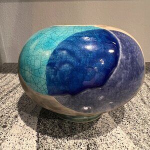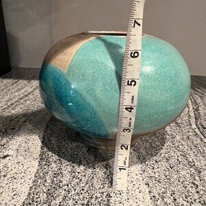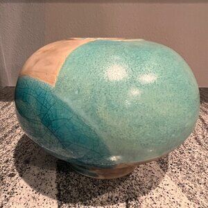 Raku Art Pottery Turquoise & Blue Round Vase Crackle Body Artist Signed