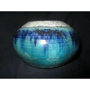 Beautiful, blue tones raku pot, by Ster. Joseph Baris. This pot is deceptively heavy, coming in at over 3 lbs. It a beautiful in its glazing finishes. The interior is dark black, hand made, spun pot. No maker's marks; however, the tags are still attached.