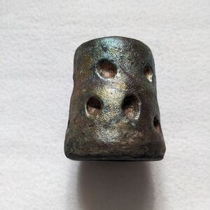 Super cute little metallic Raku pot. Handmade with dot design. Could be used as a vase or to hold trinkets. Color varies around the pot. Not food safe.