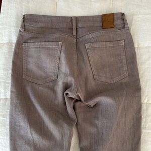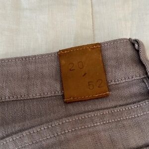 Light gray Surrey jeans by Raleigh Denim. 78% cotton, 22% elastane. One small spot of discoloration toward the bottom of the jeans.