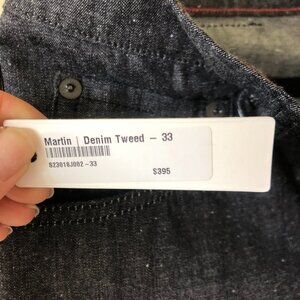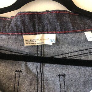 Raleigh Workshop handcrafted non-automated jeansmiths, made in USA. Brand new, never worn. Size 33. Color: "Denim tweed" -- dark wash. Red stitching. Retail $395. Asking $250, free shipping within continental US.