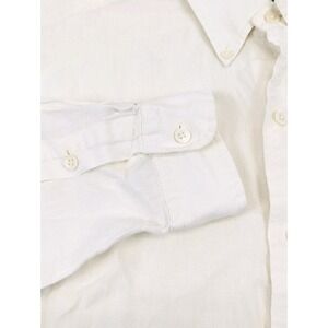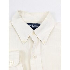 This Ralph Lauren men's linen shirt in size small features a classic button-down style with a collared neckline and long sleeves. The white shirt is lightweight, breathable, and suitable for various occasions such as travel, weddings, parties, casual outings, and business events. Made from woven linen fabric, this shirt is perfect for the summer, fall, and spring seasons. Designed with a preppy and designer theme in mind, this shirt from the Ralph Lauren product line embodies a timeless and sophisticated look for men.