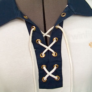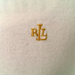 Fantastic Short sleeve shirt from Ralph Lauren. This shirt is white with a navy blue collar, and a rope closure. The Ralph Lauren initials are embroirdered on the left breast in gold thread. Like New!
