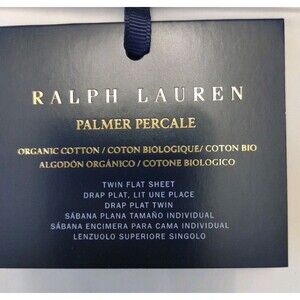 The product is a Ralph Lauren 100% Cotton Percale Palmer TWIN Flat Sheet in White with Polo Navy stripe. Made of organic cotton, this luxury bedding item has a thread count of 464 and is perfect for a bedroom setting. The brand, Lauren Ralph Lauren, ensures high quality and style, making it a stylish addition to any bedroom decor.