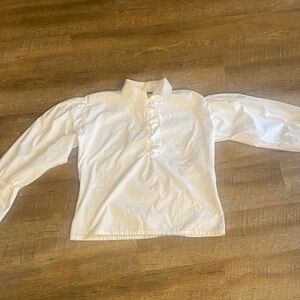 Elegant white blouse with ruffled front. Long sleeves and classic collar. The sleeves are puff style with split back. The perfect layering blouse for a preppy fall look. Perfect for formal occasions. Excellent preowned condition. No rips, stains, or odors. See all photos. The measurements are in the photos.