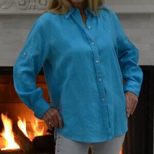 Ralph Lauren 100% Linen Shirt in Medium (Model is 5' 4", 100 pounds) Beautiful shirt is long enough to wear over leggings and tights, partially tucked, fully tucked or tied as shown. Sleeves may be worn long or rolled and secured with button and tab on each sleeve (not shown). Super comfortable, 100% linen for a classic look!
