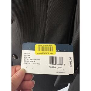 For sale is a handsome Ralph Lauren two-piece suit. This suit features a classic black pinstripe design and is made from 100% wool, offering both style and comfort. It appears to be in excellent condition, possibly unworn, with the original tag still in the pocket. It comes with a Dillard's clothing bag and a matching tie, making it a complete and sophisticated ensemble. You will love it!