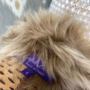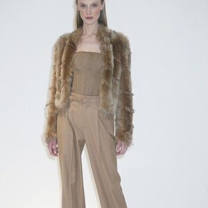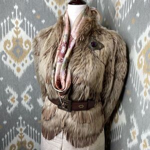 From that line came this luxe camel melange, fluffy fur & fringe jacket, constructed of perforated Italian lamb shearling, that is beautifully pieced & patch-worked together, creating a masterpiece.