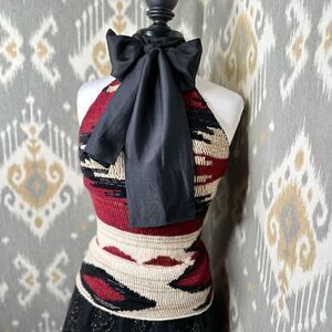 Iconic 2011 Beacon Blanket Print Cashmere Silk Wool Blend Hand-knit Bead Embellished Halter Top with Attached Silk Scarf.