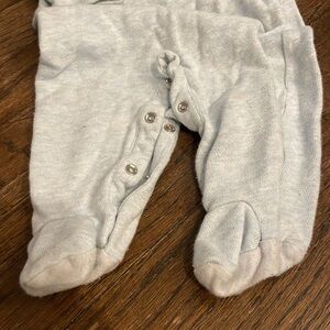 Cozy Polo Ralph Lauren Light Blue Bear Embroidered Footie Sleeper. This adorable light blue footie sleeper from Ralph Lauren features a comfortable, soft knit fabric. It has a unique shawl-style collar with snap closures, a full snap-button front for easy changing, and covers the feet. A charming embroidered gray teddy bear and "Ralph Lauren" signature are visible on the chest, adding a sweet touch. Perfect for keeping your little one snug and stylish!
