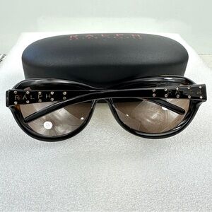 Add some glam to your look with these authentic Ralph by Ralph Lauren oversized sunglasses, model 7571/STS. Featuring a glossy tortoiseshell-style frame adorned with rhinestones along the lenses and temples, these shades are a bold and luxurious statement piece. “RALPH” branding on both arms is accented with studs for a standout touch. Comes with hard case.