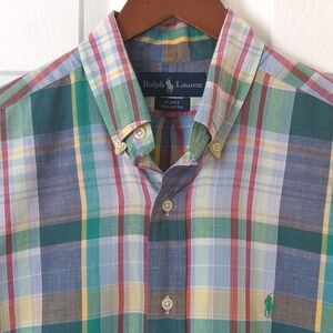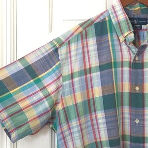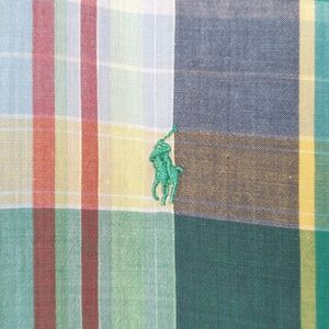 green, blue, yellow and red plaid design with the Polo logo embroidered on the upper left chest in green! It has a classic, relaxed fit and is very lightweight, soft and comfortable! Perfect to pair with khakis and loafers for a preppy retro look. Perfect for warmer Spring and Summer weather, high quality!