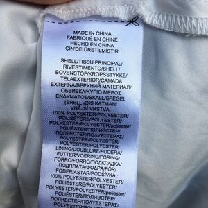 White floral printed crepe (95% Polyester, 5% Spandex). Hourglass. Short sleeves. Asymmetrical V-neckline. Hidden back zipper closure. Fully lined.