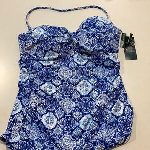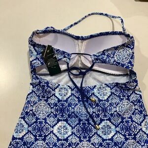 NWT $108 The Lauren Ralph Lauren Aegean Tile Twist Tubini Top in Blue. Removable halter strap. Self-tie back offers added comfort. Sewn-in wire-free padding. Shirred side seams. Tummy control. Match with your favorite white bottoms for a complete look.