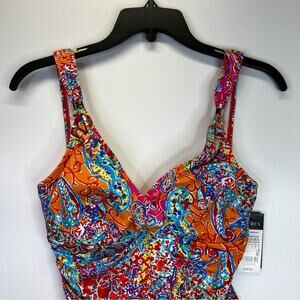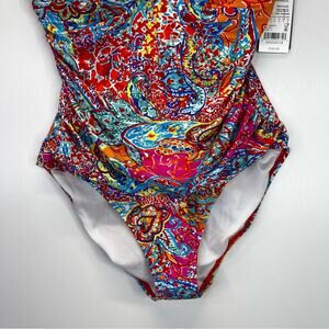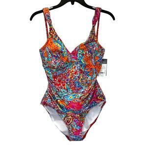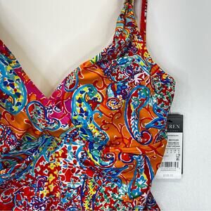 Lauren Ralph Lauren Amara Surplice Underwire One-Piece Swimsuit in multicolor. Showcases a vibrant and eye-catching design, making it a standout addition to your swimwear collection. Designed for both style and support, it features a flattering surplice neckline and underwire construction for enhanced shaping. Fully lined for added comfort and coverage, this chic swimsuit offers a confident and sophisticated look, perfect for beach days or poolside lounging.