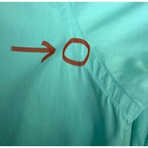 In excellent condition or gently used. No tears, fading or odors. There is a minor faded stain in between the buttons and a small stitch undone near the left arm cuff sleeve.