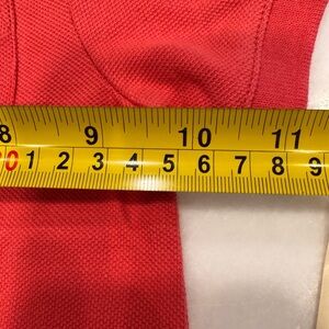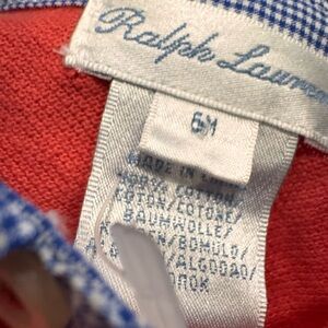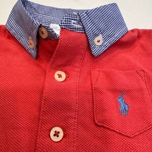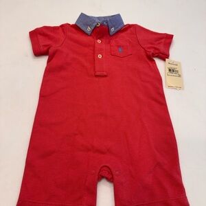 BRAND NEW with tags. Ralph Lauren baby boy polo romper. Red/salmon color with blue checkered button down collar, embroidered pony logo. ADORABLE! Size 6 months (15-18lbs). See photos for measurements