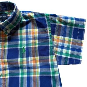 Ralph Lauren Baby Boy Madras Plaid Short Sleeve Button Down Shirt, size 24 Months. Features a vibrant madras plaid pattern in blue, green, and orange, perfect for casual or semi-formal occasions. Made from 100% cotton for comfort. Excellent pre-owned condition, no stains or holes.