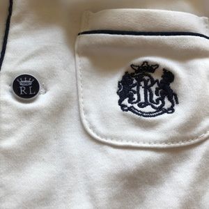 Sweet little Ralph Lauren shortall! White with navy blue piping, 5 buttons down the front, snap buttons at the bottom. Pima cotton. In great condition - one tiny dot on the pocket as shown in the third photo. May come out with washing and totally not noticeable.