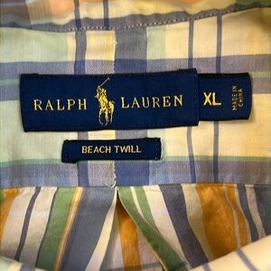 Ralph Lauren Men’s Beach Twill Cotton Plaid Short Sleeve Shirt in Blue/Yellow/Green/Orange pastels. Light and airy. Botton down. Front chest pocket.