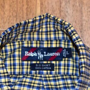 Long sleeve button up shirt by Ralph Lauren. Size Large and 100% cotton. Style: Big Shirt. Oversized shirt with plaid pattern in yellow/blue/black. In excellent condition with no holes, tears, or stains. Comes from a smoke free home.